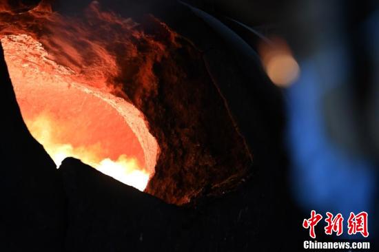 金川集團(tuán)鎳冶煉廠閃速爐車間內(nèi),工作人員穿戴專業(yè)防護(hù)裝備觀察轉(zhuǎn)爐天然氣烤爐。