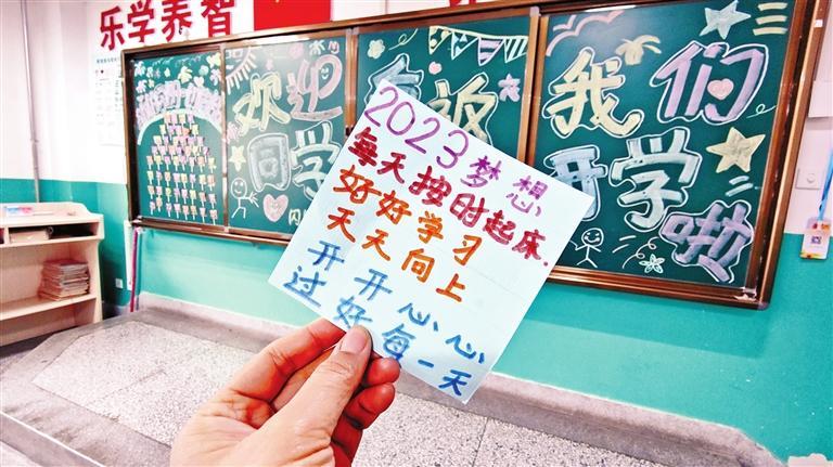 龔家灣第三小學(xué),孩子們展示裝有新學(xué)期目標的福袋。