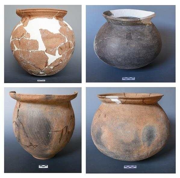 古城村遺址面積約4.2萬(wàn)平方米,現(xiàn)存的貝丘堆積最厚處達(dá)6.5米,由大量尾部被敲破的螺螄殼與灰土層交替堆疊形成。碳十四測(cè)定年代為距今3600至2500年,約相當(dāng)于中原地區(qū)的商代至兩周時(shí)期。商代遺存可分為早晚兩段,早段發(fā)現(xiàn)保存完整的橢圓形環(huán)壕聚落,由中心臺(tái)地、外圍環(huán)壕和護(hù)坡組成,中心臺(tái)地面積約27000平方米,環(huán)壕和護(hù)坡周長(zhǎng)約600米,這種聚落格局一直延續(xù)至兩周時(shí)期。商代晚段發(fā)現(xiàn)一批土坑墓和甕棺葬。兩周時(shí)期的遺存以房址、螺殼堆、灰燼、活動(dòng)面等居住類(lèi)遺跡為主,房址多為方形半地穴式。出土青銅器、陶器、玉器、石器、骨器、木器等文物4000余件。