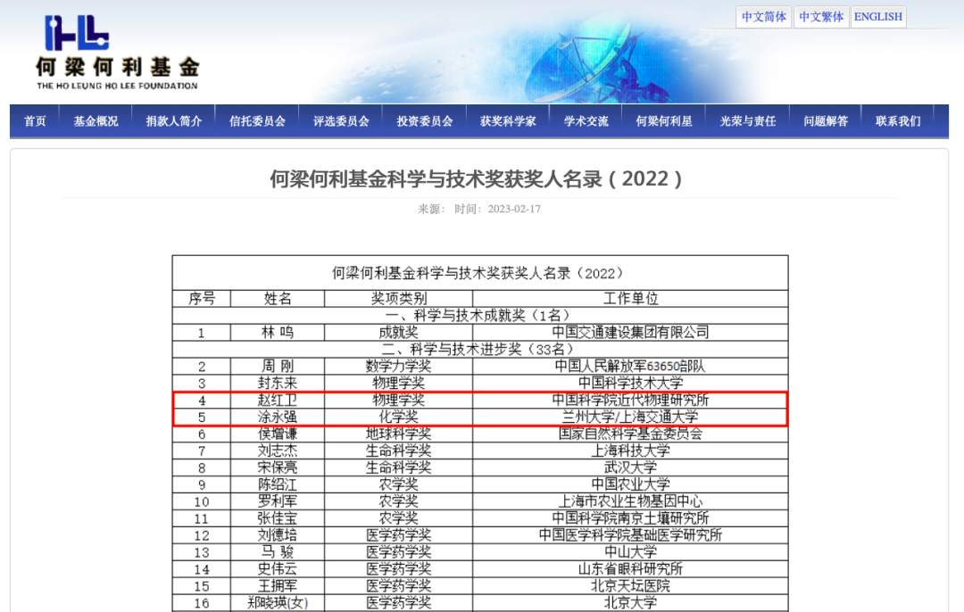 日前,何梁何利基金2021和2022年度頒獎大會在北京舉行,共授予112名杰出科技工作者。其中,中國科學(xué)院近代物理研究所趙紅衛(wèi)、蘭州大學(xué)涂永強榮獲2022年度何梁何利基金科學(xué)與技術(shù)進步獎。