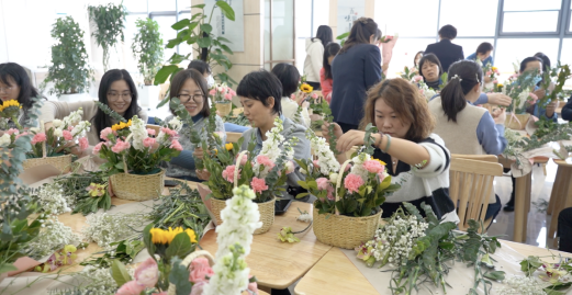 繁花似錦報春來,天姿國色抒情懷?;顒蝇F(xiàn)場花香四溢、芬芳溫馨,充滿著春天般的氣息,大家手捧鮮花,在花藝?yán)蠋煹闹v解下,開始學(xué)習(xí)各種鮮花所蘊(yùn)含的花語祝福和選花、裁剪、搭配、造型及養(yǎng)護(hù)等藝術(shù)插花技巧。隨后,女工們將原本普普通通的月季、康乃馨、蝴蝶蘭、滿天星、向日葵等多種花材修剪整枝,根據(jù)不同的色彩和形狀有層次地搭配在一起。通過精心構(gòu)思造型、發(fā)揮創(chuàng)意想象,有的注重意境創(chuàng)設(shè)追求,有的突出枝情花韻之趣,有的抒展自然樸實風(fēng)格……在細(xì)致地修飾和精心地創(chuàng)作下,一枝花、一棵草都變得詩情畫意和清新怡人,節(jié)日的喜慶氣氛瞬間升騰。