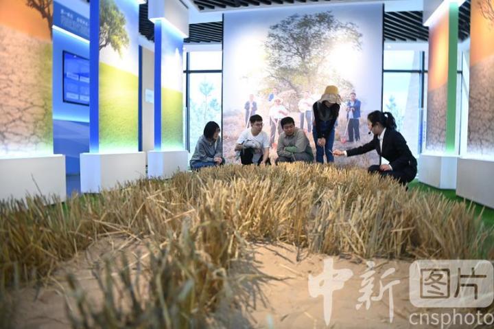 4月16日,甘肅省武威市古浪縣,學(xué)生們在八步沙兩山實(shí)踐創(chuàng)新基地參觀了解當(dāng)?shù)靥禺a(chǎn)。