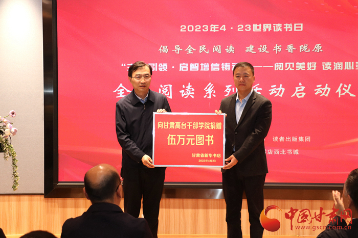 啟動(dòng)儀式上,讀者出版集團(tuán)黨委書記、董事長(zhǎng)梁朝陽(yáng)向高臺(tái)干部學(xué)院捐贈(zèng)圖書并宣布系列活動(dòng)正式啟動(dòng)。讀者出版集團(tuán)黨委委員、副總經(jīng)理王光輝與甘肅省新華書店黨委書記、董事長(zhǎng)張曉東向讀者代表“甘肅好人”景正紅、“優(yōu)秀護(hù)士”嚴(yán)曉麗、“公安之星”王令成、“優(yōu)秀教師”王云芳捐贈(zèng)圖書。