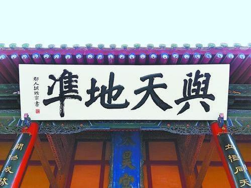 “與天地準(zhǔn)”出自《周易·系辭傳上》。原句為:“易與天地準(zhǔn),故能彌綸天地之道”。準(zhǔn),意為等、等同(此依高亨解)。有學(xué)者或?qū)?ldquo;準(zhǔn)”解釋為標(biāo)準(zhǔn),或解釋為法則等,唯高解最貼原意;彌,意為遍,普遍;綸,意為絡(luò),包絡(luò)。彌綸,意即普遍包絡(luò)。此句可釋為:《易》所闡述的“性命之理”是與天地運(yùn)行的自然法則等同的,所以它能夠包容天地之間萬事萬物的運(yùn)行規(guī)律。匾文“與天地準(zhǔn)”,是贊頌伏羲首創(chuàng)的八卦,高度概括了天地萬物運(yùn)行之規(guī)律,為人們認(rèn)識(shí)世界、改造世界提供了思想武器。