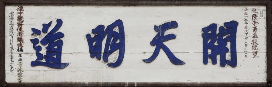 該匾懸于天水伏羲廟大門前牌坊正中。長3.5米,寬1.25米,厚0.12米。素邊,匾心白底藍(lán)字,上下款朱書。此匾有雙上款和雙下款。第一個(gè)上款為“乾隆辛酉孟秋既望”,下款為“湟中觀察使者遼海楊應(yīng)琚薰沐敬書”;第二個(gè)上款為“嘉慶十二年歲次丁卯五月吉旦”,下款為“中憲大夫?qū)幭母蜓a(bǔ)知秦州事王公重建”。