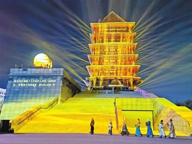在黃河樓景區(qū),平時只有周末觀演的“黃河頌·大有蘭州”多媒體實景演出開啟了為期一個月的常態(tài)化巡演,每晚9時,璀璨的光影映襯著巍峨雄壯的黃河樓,在3D Mapping多媒體技術的加持下,帶給游客難忘的光影夜游體驗。而近日黃河樓入園游客較平時也增長了3倍之多,登樓參觀人數日均達到3000人次。