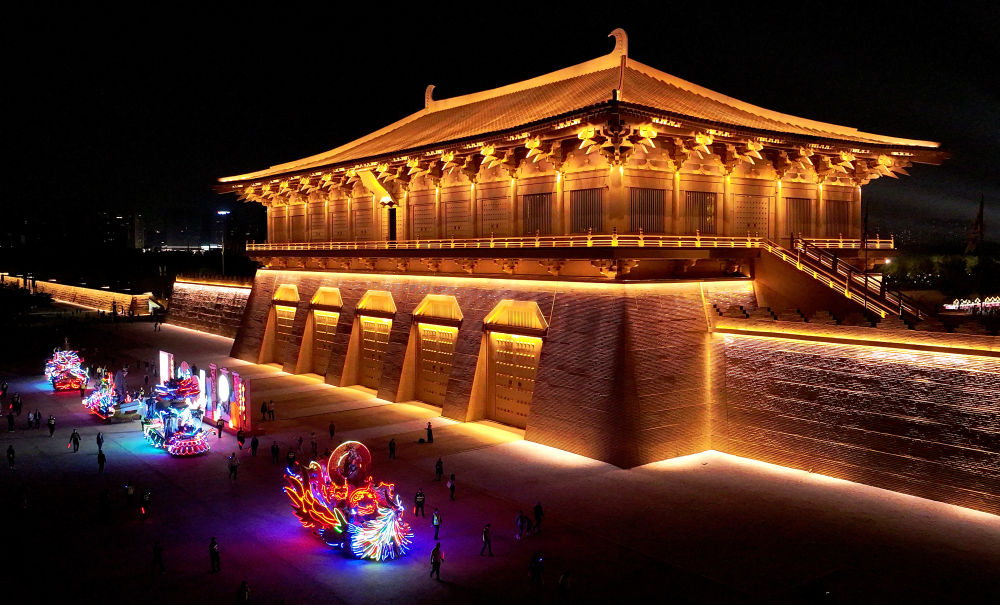 巡游彩車從西安大明宮國(guó)家遺址公園丹鳳門前駛過(2023年9月30日攝,無人機(jī)照片)。新華社記者 劉瀟 攝
