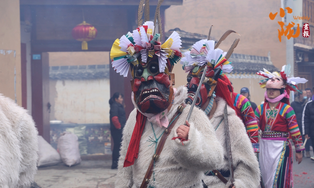 表演的隊伍圍著寨子挨家挨戶去跳,舞者至少三人,三人以上不限,皆頭戴面具,在“咚咚咚”的鼓聲和“哐哐哐”的鑼聲伴奏下激烈地跳躍,最后跳到田邊地角為止。