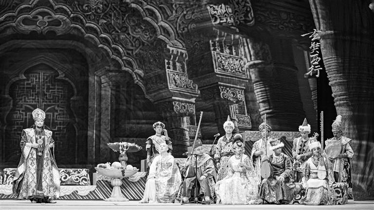 《玄奘西行》靠音樂的轉(zhuǎn)換,把人物內(nèi)心通過(guò)音樂表達(dá)出來(lái),將人物的心理變化賦予戲劇張力。姜瑩給甘肅省歌舞劇院演出的《玄奘西行》專門配了一版交響樂的伴奏,希望通過(guò)交響樂把底子鋪好,通過(guò)交響樂和民樂的融合達(dá)到氣勢(shì)恢宏的效果。