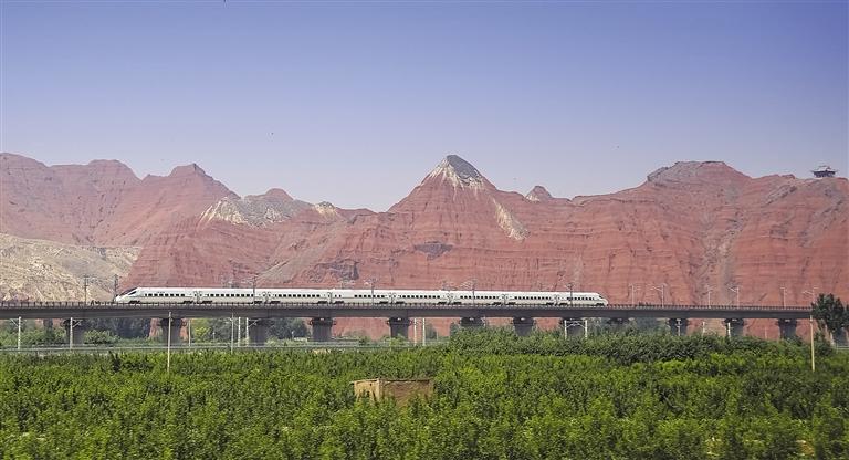 在這里,通紅的山體被風(fēng)蝕出獨(dú)特的形狀,不同巖石礦物讓山體呈現(xiàn)五彩的顏色,在湛藍(lán)天空下越發(fā)艷麗奪目??展扔朴浦袝r(shí)而傳來轟鳴,白色游龍?jiān)谏介g舞動,風(fēng)馳電掣駛過絕美丹霞,大自然的鬼斧神工與現(xiàn)代科技的智慧結(jié)晶交相輝映,共同構(gòu)成一幅瑰麗的畫卷。等待、抓拍、回看……“發(fā)現(xiàn)團(tuán)”的成員們在烈日下不斷重復(fù)著相同的動作,在這里領(lǐng)略蘭新高鐵動車組列車穿越火紅丹霞的精彩瞬間,時(shí)刻端起手中的相機(jī),不斷記錄復(fù)興號動車組與錦繡山河同框的壯觀畫面,感受繁忙的西部高鐵。