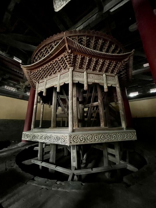 轉(zhuǎn)輪藏指可以轉(zhuǎn)動的經(jīng)書架。它始建于北宋、直徑達7米,榫卯相嵌形成一座古樸的八角亭。八根方柱自頂部向下收縮,將重量匯至一點。“如此巨大的木建筑,一兩人就能推動,常令游客驚嘆。”正定縣隆興文化旅游發(fā)展有限公司講解員王瑋瑤說。