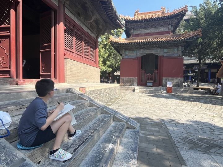 夜幕低垂,華燈初上,身著漢服的女孩徐行古跡之間。烈日當(dāng)頭,少年定坐在古老建筑旁安靜臨摹,筆下的雕梁畫棟多了樸拙意趣。“正定的古建筑很美,畫之前要細細觀察,但不能原封不動地畫。畫得好,就很滿意、很開心。”今年12歲、從北京前來研學(xué)的米騰飛說。