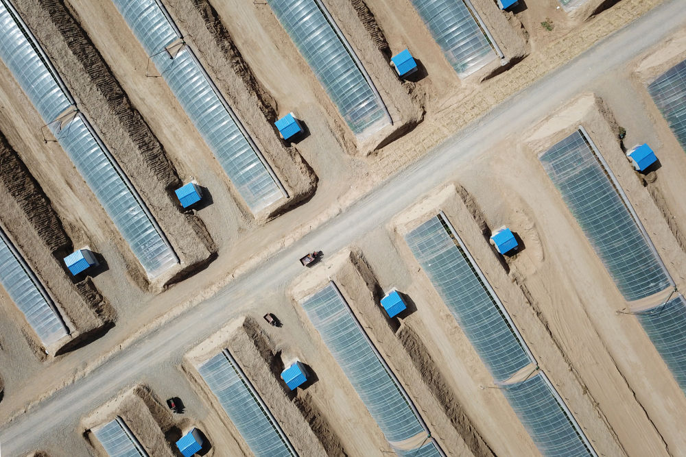 在古浪縣干城鄉(xiāng)富民新村,村民駕駛三輪車行駛在日光溫室大棚間的道路上(無人機照片)。新華社記者范培珅攝