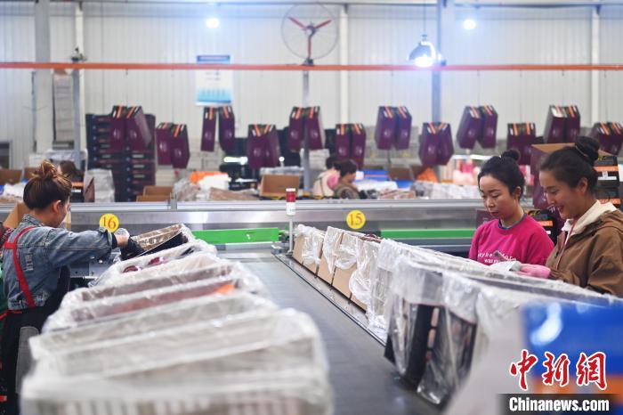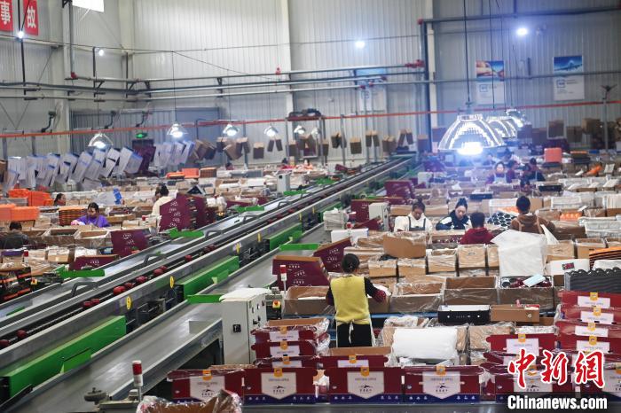 10月21日,在甘肅省天水市秦安縣雪原果品有限公司加工車間,蘋果自動化分揀線上工作人員進(jìn)行分揀工作。中新社記者李亞龍攝
