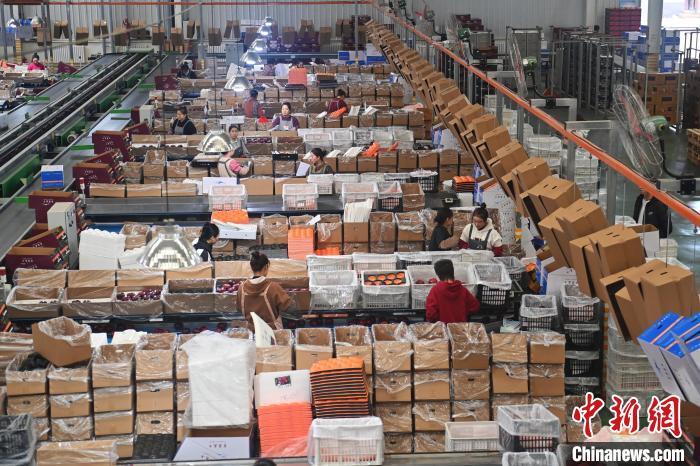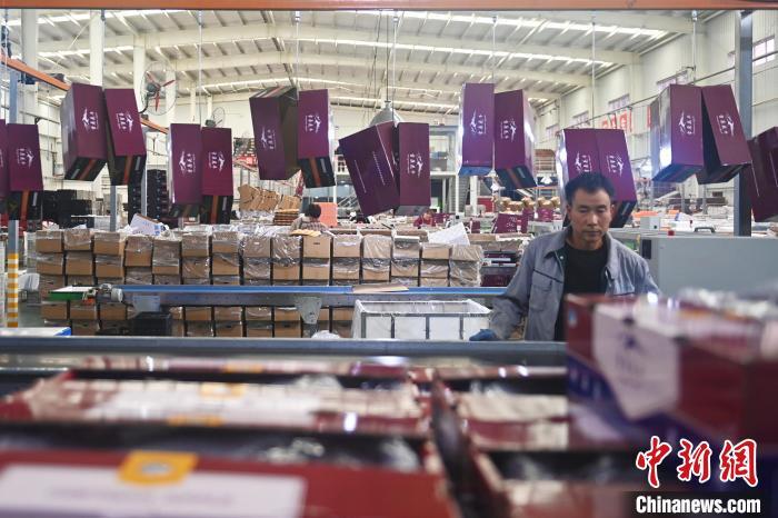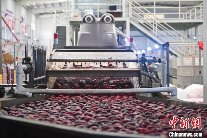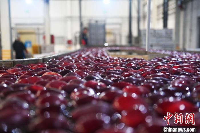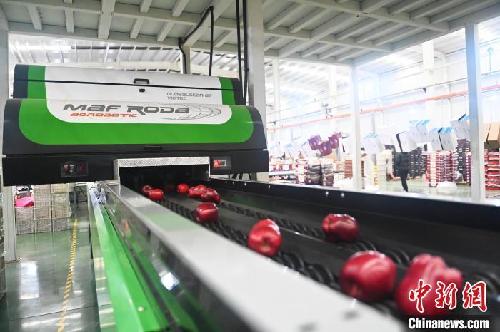 10月21日,在甘肅省天水市秦安縣雪原果品有限公司加工車間,蘋果自動化分揀線正在運行。中新社記者李亞龍攝