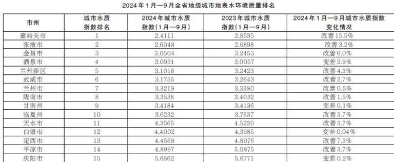 省生態(tài)環(huán)境廳發(fā)布2024年1月—9月全省14個(gè)地級(jí)城市及蘭州新區(qū)地表水環(huán)境質(zhì)量排名情況
