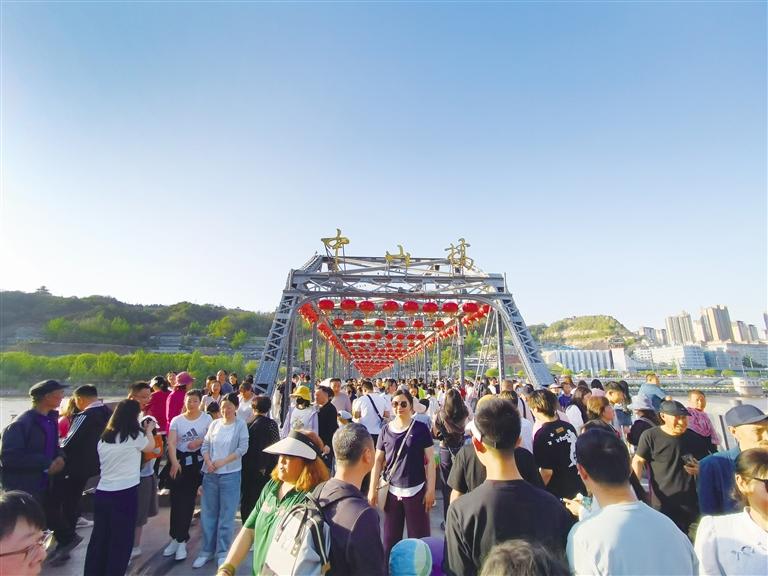 蘭州以火樣熱情和西北風(fēng)情吸引天南海北游客紛至沓來(lái),人們?cè)跓熁饸夂臀幕吨g尋找到這座城市的獨(dú)特魅力。圖為中山橋前游人如織。