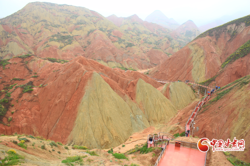 游客們乘坐觀光車沿途游覽,絲路霞光、九色丹青、丹頂攬勝等7個(gè)觀景平臺各具特色,山體色彩斑斕、紋理交錯(cuò),雨后更如水墨畫般淡雅別致,與北宋《千里江山圖》、元代《富春山居圖》的意境神似。