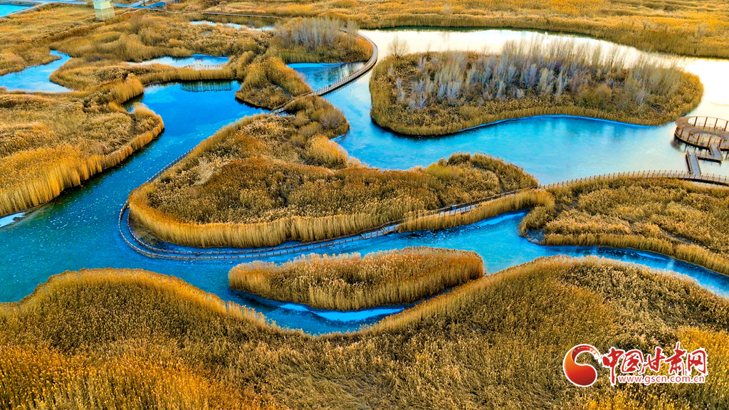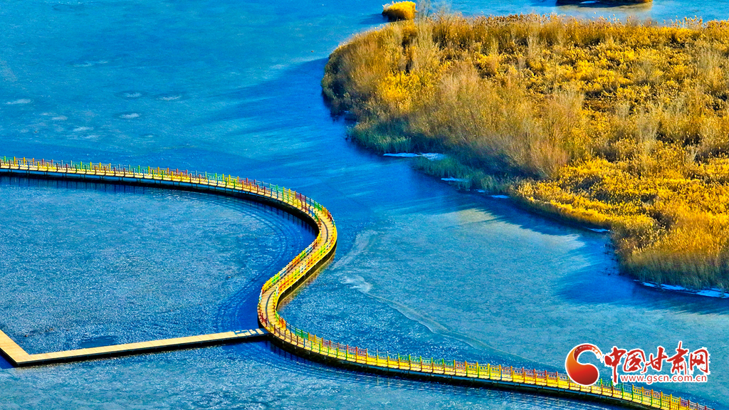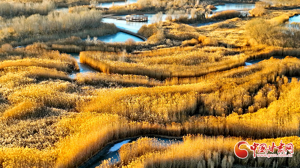 12月4日,張掖市黑河濕地國家級自然保護區(qū)內,經(jīng)風霜浸染的蘆葦與蒲草披上金裝。從高空俯瞰,夕陽下的蘆葦蕩如金色海洋,蘆花隨風輕舞,碧水凝冰環(huán)繞其間,宛如一幅鋪展的濕地金畫卷,吸引眾多游客與攝影愛好者前來觀賞拍攝。