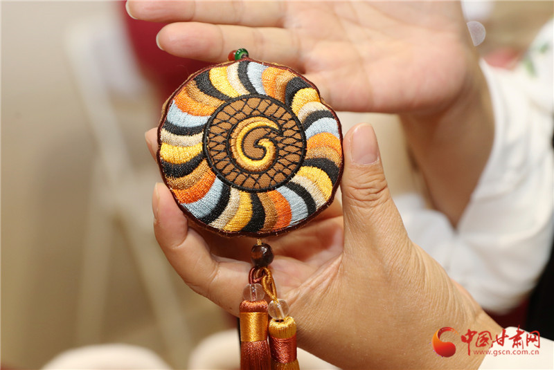 真正讓她想“給香包加點新東西”,是一次省博看展的觸動。站在馬家窯彩陶罐前,她盯著罐身流轉(zhuǎn)的旋渦紋出了神:“這么好看的紋路,繡在香包上多妙?”后來去敦煌,莫高窟里飛天的飄帶、藻井的繁復花紋更讓她挪不開腳。回來的路上,一個念頭愈發(fā)清晰:要讓博物館里的文物“活”在香包里,讓老手藝沾染上“文化氣”。