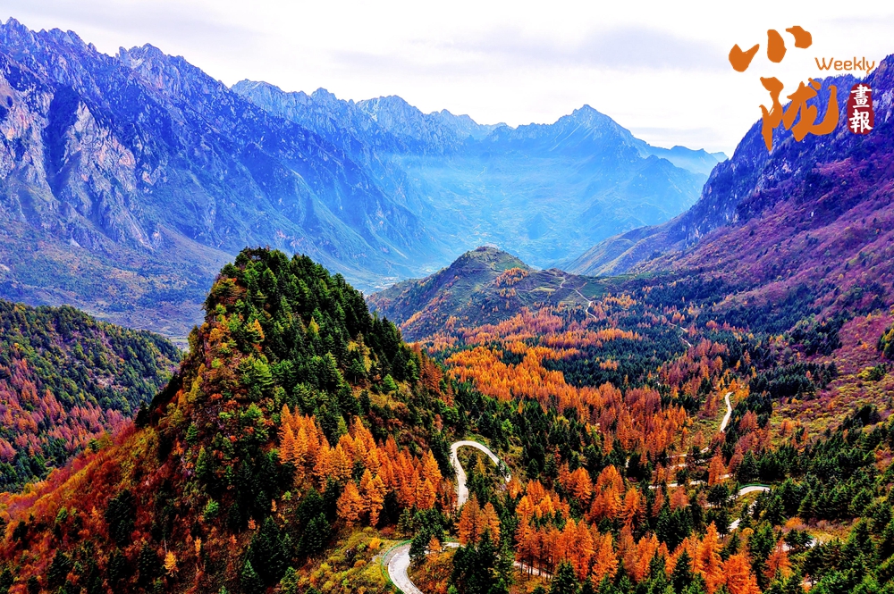 山體像被誰用巨筆勾勒出輪廓,再以濃墨重彩層層暈染,彩林如五彩斑斕的錦緞鋪展至天邊。