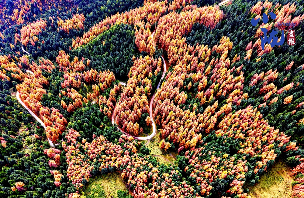 從空中俯瞰,彩林點(diǎn)綴,層層疊疊、錯(cuò)落有致,在這片彩色畫卷中,一條小路蜿蜒伸展,似銀蛇游走,為這靜謐的畫面增添了靈動的韻律。