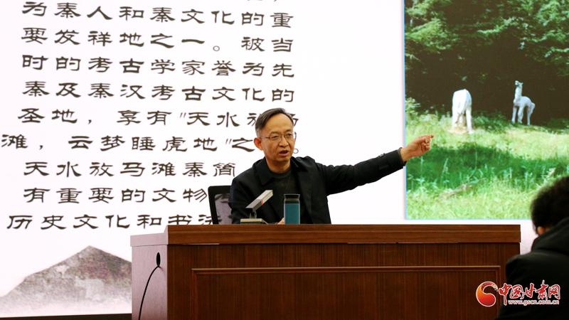 他介紹,地處天水麥積山的放馬灘,因秦先祖牧馬得名,1986年出土的461枚戰(zhàn)國晚期秦簡,以時代早、保存完整被定為國家一級文物。這批秦簡以小篆為主、間雜隸書,清晰勾勒出戰(zhàn)國晚期漢字“隸變”軌跡,還暗藏章草雛形;其內容涵蓋甲乙兩種《日書》與《志怪故事》,既是研究秦代社會、民俗的珍貴史料,《志怪故事》更是中國最早傳奇小說的雛形。與此同時他結合甘肅“簡牘之鄉(xiāng)”的定位,提出放馬灘秦簡研究應加強省際學術交流,將簡牘資源優(yōu)勢轉化為地方文旅發(fā)展動能。