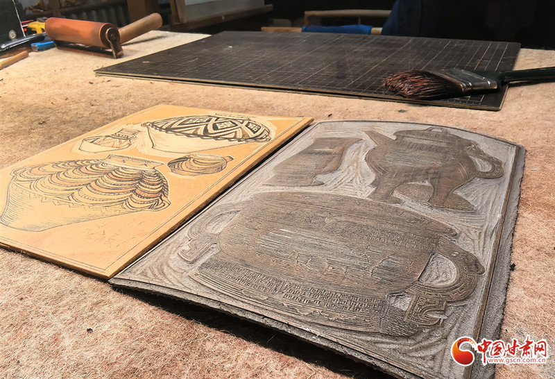 手稿繪制好了之后,就要進行硫酸紙轉稿了。趙寧耐心地解釋道:“所謂‘硫酸紙轉稿’,就是用鉛筆在硫酸紙上仔細勾描輪廓。然后再通過復寫紙,將線稿小心翼翼地轉到準備好的版面上。接著,就可以用刻刀在版面上進行刻制了。”說著,他拿起刻刀,輕輕在版面上刻下第一刀,那動作嫻熟而自信。刻制完成后,用毛刷掃刷干凈碎屑。隨后,他拿起油滾,均勻地在版面上滾墨,每一次滾動都小心翼翼,直到版面油墨均勻,才滿意地點點頭,準備進行拓印。