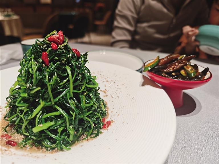 在和家和大酒店,春季限定菜單格外吸睛:頭茬香椿炒雞蛋、丁香魚拌苜蓿芽、豌豆湯煮豌豆苗、油燜鮮春筍、咬春蔬菜團等經(jīng)典與創(chuàng)意春菜一應俱全。