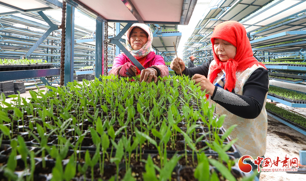 工作人員正在將培育好的辣椒苗轉(zhuǎn)移到培育大棚