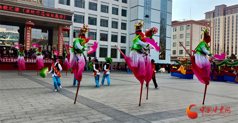 秧歌精華盡在“身子”表演。中郎與臘花姐成雙配對,少則十對四十人,規(guī)模隨隊伍靈活增減,女角腳踩一米以上木制高蹺,彩扇絲巾相映成趣。場地表演“舞花場”節(jié)奏明快、走位繁復(fù),行進表演舒緩舒展,男引女隨、穿插盤旋,伴奏《十盞燈》《十二個月》曲調(diào)悠揚。進退場時,表演者大步狂舞、彩帶飛揚,鑼鼓齊鳴、鞭炮喧天,將西北年俗的熱烈奔放推向極致。