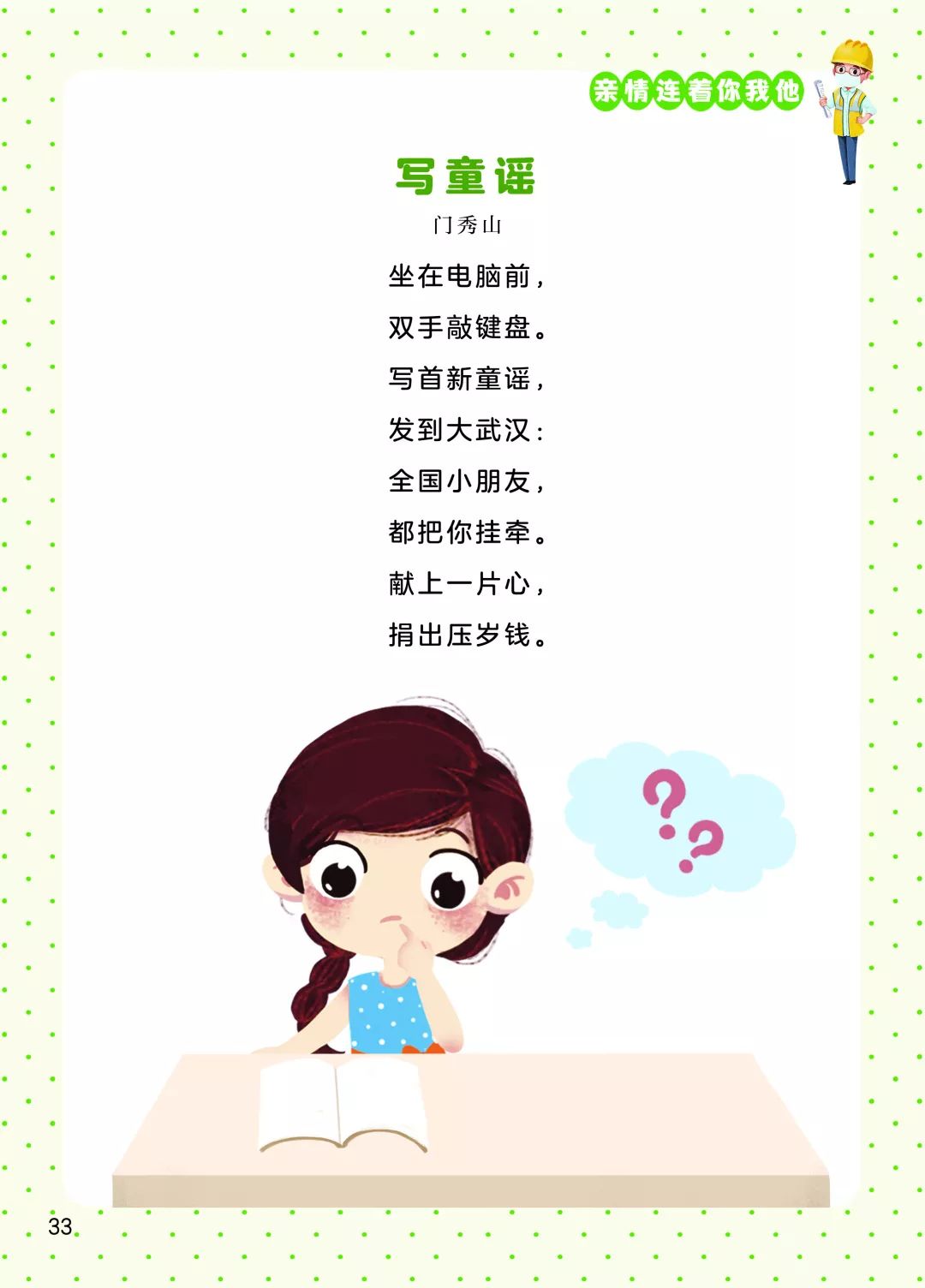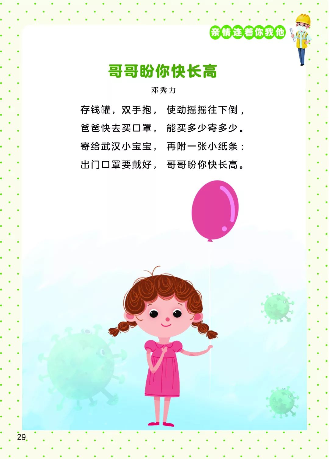 讀者出版?zhèn)髅焦煞萦邢薰舅鶎俑拭C少年兒童出版社積極響應(yīng)、主動作為,聯(lián)合“葫蘆文產(chǎn)”,策劃了《投降吧,新冠病毒——2020戰(zhàn)“疫”童謠60首》一書,將這些優(yōu)秀的童謠作品進行編輯加工,以期提高兒童科學(xué)防護意識,幫助大家堅定抗“疫”勝利的信心。本書通過數(shù)字版向讀者免費推送,為打贏這場疫情防控阻擊戰(zhàn)貢獻一份力量。