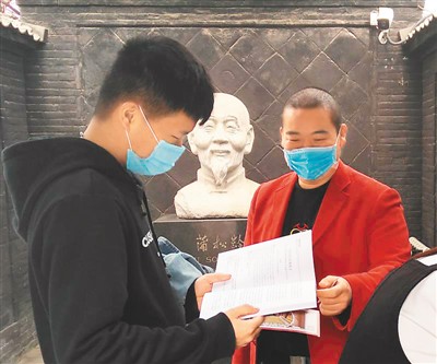 3月24日,山東省淄博市蒲松齡紀(jì)念館復(fù)工。圖為工作人員向第一批游客贈書。 曹檸薇攝