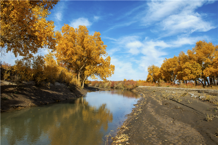 望桿傲立胡楊樹,逾萬年難腐??村\繡金黃,彩袂飄飄,持練當(dāng)空舞。