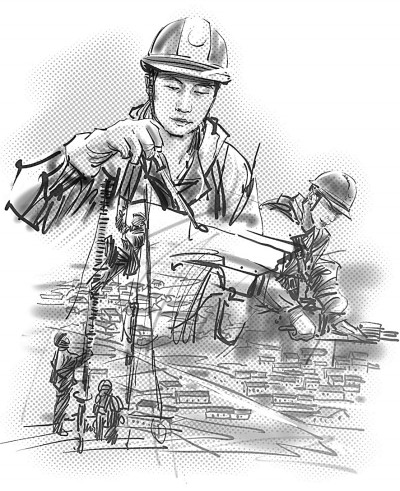 就個人條件而言,胡洪煒一米八的身高其實(shí)并不適合帶電作業(yè),但三年軍營練就的結(jié)實(shí)精壯以及先天的敏捷機(jī)靈完美地補(bǔ)充了身高的短板。多年之后,閆旭東依然清晰地記得徒弟曾經(jīng)帶給他的震撼。帶電作業(yè)兩大危險,一是高空,一是帶電。軟梯是電力人得以騫翮遠(yuǎn)翥的依傍,可攀爬軟梯卻一度打濕了胡洪煒振翅欲飛的翅膀。新員工入職培訓(xùn)的訓(xùn)練場上,別人用一個月已經(jīng)熟練掌握了技巧,笨鳥胡洪煒卻剛剛及格。氣喘吁吁地爬到基塔的頂端,將自己蟄伏在離地面幾十米高的電線上,想像自己是一只俯瞰大地的鳥雀,一只暫時休整的雨燕,抑或是被印刷在音樂課本上的音符。音符在胡洪煒耳邊輕聲吟唱:我要飛得更高,更高!