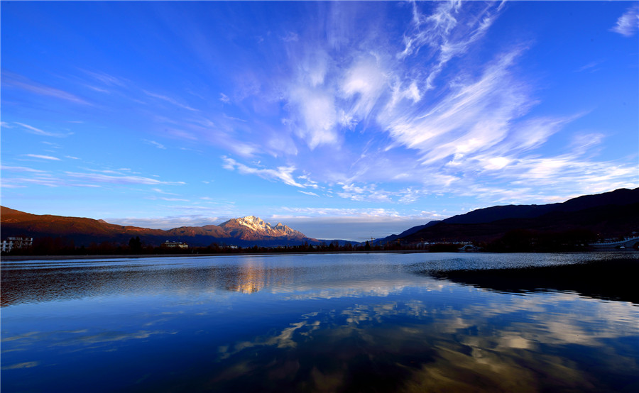 我是被亮光驚醒的。我和很多水從象山腳下的黑龍?zhí)睹俺鰜?lái)。咕咚一聲翻上水面??匆?jiàn)很多不同模樣的人。黑頭發(fā)的人,黃頭發(fā)的人。黑眼睛的人,藍(lán)眼睛的人。我看見(jiàn)了潭邊的亭臺(tái)樓閣??匆?jiàn)了花與樹(shù)。我還順著人們遠(yuǎn)眺的目光看見(jiàn)了玉龍雪山,晶瑩奪目矗立在藍(lán)天下面。潭水映照雪山,真讓人目眩神迷啊。人們?cè)跇蛏?,在堤上,說(shuō)著不同的語(yǔ)言。在不同的語(yǔ)言里,都有那個(gè)詞頻頻出現(xiàn):麗江,麗江。這時(shí)的麗江已經(jīng)是一座很大的城了。城里也不是只有最初筑城的納西人了。如今全中國(guó)全世界的人都要來(lái)麗江,看納西古城的四方街,看玉龍雪山。