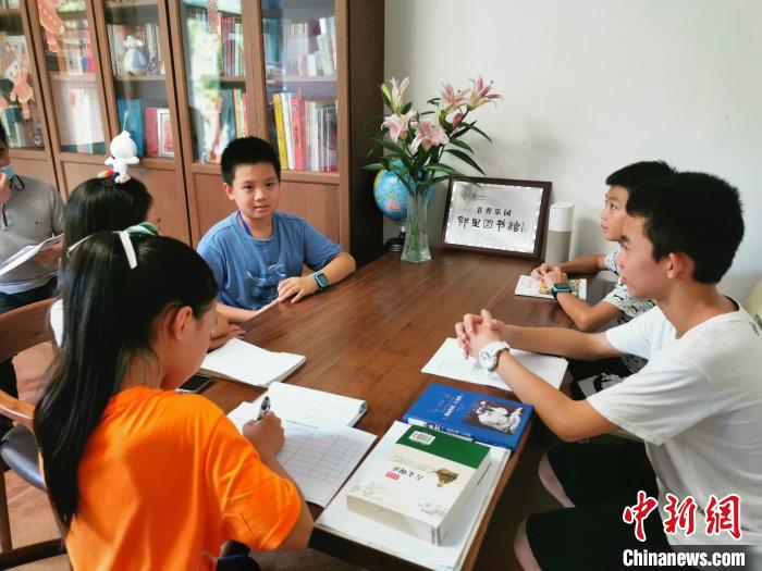 在書(shū)香樂(lè)園鄰里圖書(shū)館,小館長(zhǎng)莫岱妮正組織同學(xué)在家里進(jìn)行古詩(shī)詞競(jìng)猜游戲?!?yīng)妮 攝