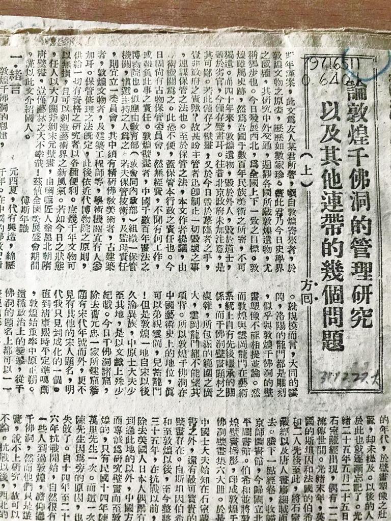 向達(dá)先生曾先后兩次考察敦煌,第一次是在1942年4月,中央研究院組織西北史地考察團(tuán),其中的歷史考古組由中央研究院歷史語言研究所、中央博物院與北京大學(xué)聯(lián)合組成,向達(dá)代表北大并擔(dān)任歷史考古組主任。在這次考察中,他在給友人、南京博物院院長曾昭燏的信件中講述了他第一次看到敦煌莫高窟時(shí)的激動(dòng)心情,同時(shí)對(duì)于莫高窟受到自然和人為的毀壞而感到痛心。他用三天的時(shí)間寫成了一萬多字、此后對(duì)敦煌學(xué)有重大影響的《論敦煌千佛洞的管理研究以及其他連帶的幾個(gè)問題》,署名“方回”寄給了傅斯年,后經(jīng)傅斯年推薦,在重慶的《大公報(bào)》連載發(fā)表,文中提出將千佛洞收歸國有,由學(xué)術(shù)機(jī)構(gòu)進(jìn)行管理,開展研究工作等建議。此文發(fā)表,一石激起千層浪,直接推動(dòng)國立敦煌藝術(shù)研究所于1944年成立。研究所成立后,常書鴻任所長。這也開啟了“敦煌學(xué)”長流不息的淵源。樊錦詩后來也撰文稱:“他(向達(dá))文章中提出的關(guān)于保護(hù)和管理的具體建議,被后來成立的敦煌藝術(shù)研究所采納,成為敦煌石窟保護(hù)和管理的參照。向達(dá)提出的‘不可輕易剝離壁畫’的主張,也是敦煌研究院幾十年來在壁畫保護(hù)和管理中一直恪守的紀(jì)律和原則。”