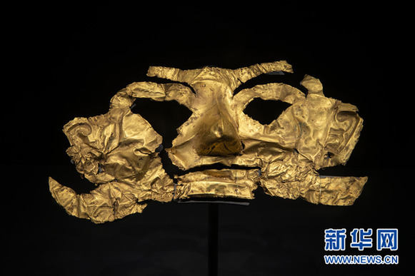 位于四川省廣漢市的三星堆博物館拍攝的出土于三星堆1號“祭祀坑”的金面罩。新華社