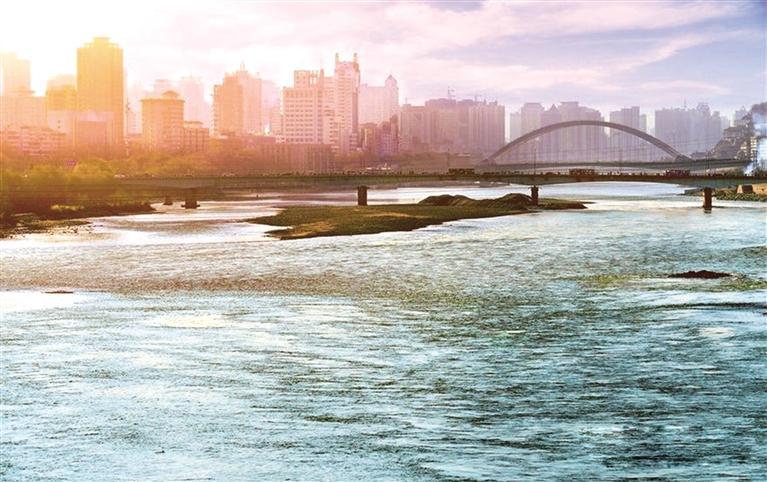 河分南北,勢(shì)接?xùn)|西。舒寧陜之博帶廣袖,帶青藏之峨冠雪衣。山逶迤而續(xù)祁連,水澎湃而瀉右?guī)住R洮湟之迤邐,有容乃大;與華夏之康莊,唇齒相依??睾游髯呃?,自古而始;俯渭涇秦川,由朝至夕。綴葫蘆狀岸渚坪灘,幾多古渡;依膏腴處坡谷盆地,即就蕃息。筑虹蜺經(jīng)百年,鐵橋第一;盤游龍於今朝,立交數(shù)十。去病鞭地,五泉山勝于秀逸;永誠(chéng)建院,白塔寺高于云齊。指點(diǎn)九州,大禹登九州之臺(tái);漂流黃河,洋人恐招手之磯。草覆馬銜而能牧,林茂興隆云可棲。繞營(yíng)盤高嶺排五,峙雄關(guān)沿河有七。留千古名,白馬浪細(xì)聽湍流不息;鎖萬代鑰,金城關(guān)只留站牌不奇。雷壇留碑,金天觀曾殿宇壯麗;華林無寺,節(jié)能燈照幽路石基。湍流黃河,九曲回腸依然東去;水轉(zhuǎn)輪盤,十方高地亦滿紛披。