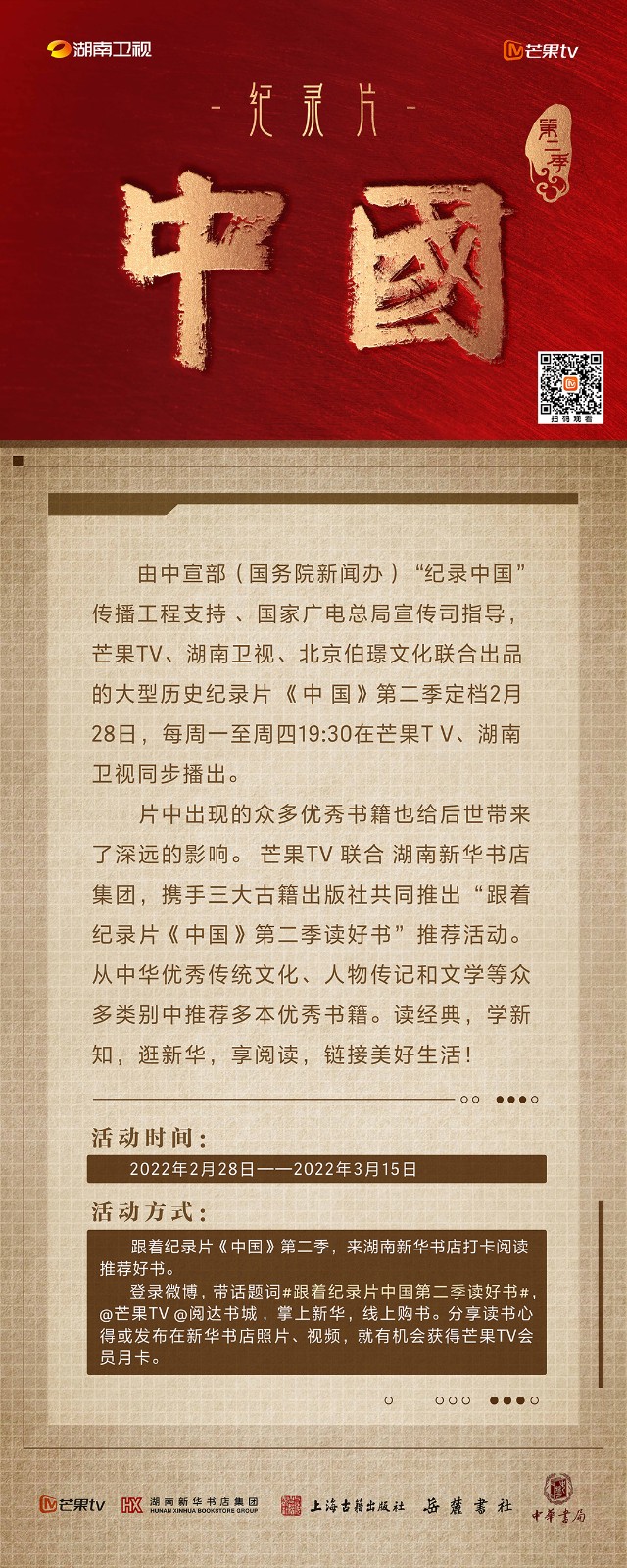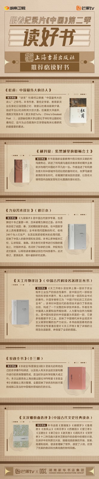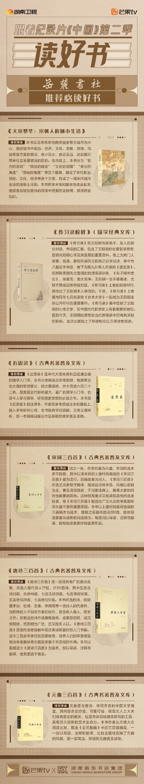 芒果TV以紀(jì)錄片《中國》第二季的精美品質(zhì),聯(lián)合湖南新華書店集團(tuán)的美譽(yù)口碑,將中華書局、上海古籍出版社、岳麓書社推薦的珍品好書,傾情向大眾推薦。本次“跟著紀(jì)錄片《中國》第二季讀好書”活動(dòng),將從2月28日持續(xù)到3月15日,湖南新華書店集團(tuán)旗下湖南圖書城、不吝Boolink書店、全省市級(jí)中心門店、長沙地區(qū)樂之書店等全員參與,推薦紀(jì)錄片《中國》第二季。書友及觀眾可登錄微博或到線下門店打卡參與活動(dòng)。