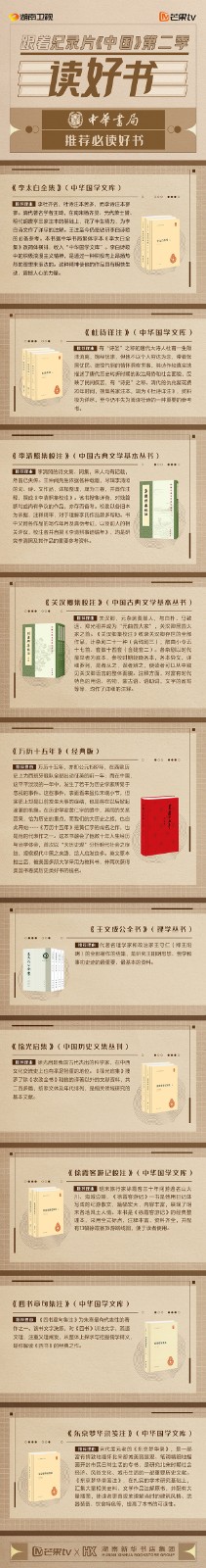 紅網(wǎng)時(shí)刻3月7日訊(通訊員 王平)紀(jì)錄片《中國》第二季每周一至周四19點(diǎn)30分,芒果TV、湖南衛(wèi)視正在熱播,為了更好地傳播中國故事,讓不朽人物和偉大思想突破影像空間的限制,可知、可感、可觸地融入日常生活,芒果TV聯(lián)合湖南新華書店集團(tuán),攜手中華書局、上海古籍出版社、岳麓書社共同推出“跟著紀(jì)錄片《中國》第二季讀好書”推薦活動(dòng),共享閱讀,鏈接美好生活,傳遞人文情懷。