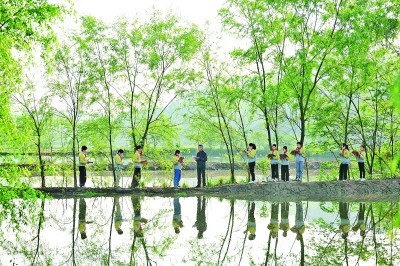 在江西萬載縣馬步鄉(xiāng)洞口村,老師和學(xué)生們在柳樹下閱讀。鄧龍華攝/光明圖片