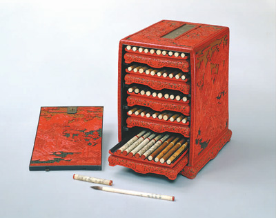 文房四寶與讀書人的關(guān)系十分密切。展廳里陳列的宮中文房用具非常精美,引得觀眾駐足細(xì)賞。一件飾有云山水岸圖案的紅漆筆匣,里面裝著50支毛筆,每支筆材質(zhì)、裝飾、筆頭造型各不相同,筆管上分別題有乾隆在不同時(shí)期所撰詠花詩(shī)。