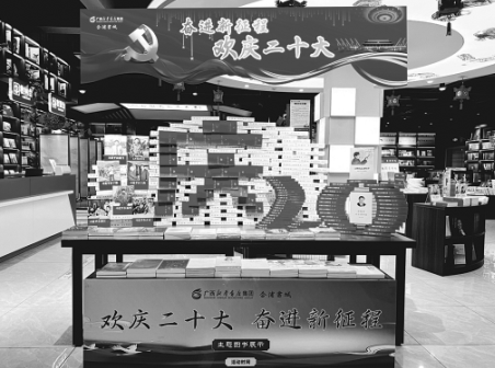 廣西新華書店集團股份有限公司組織全區(qū)各連鎖門店先后開展了“喜迎二十大 助力新發(fā)展”主題圖書展示展銷、“歡慶二十大 奮進新征程”主題系列活動。廣西新華書店集團股份有限公司相關(guān)負責人介紹,全區(qū)門店近期開展“歡慶二十大 奮進新征程”主題門店美陳大賽,通過精選出111個全國近期出版的主題圖書品種進行重點展示,配套主題海報、背景板,以各門店融合當?shù)靥厣拇a堆造型進行整體美陳,向廣大讀者推薦一批導向正確、質(zhì)量上乘的優(yōu)秀主題圖書。