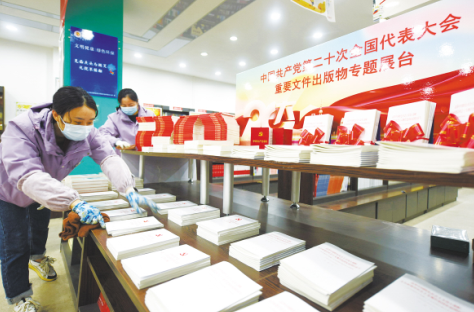 連日來,江蘇省連云港市東海縣新華書店精心設(shè)置了黨的二十大重要文件出版物專題展臺(tái),集中展示展銷黨的二十大文件及學(xué)習(xí)輔導(dǎo)讀物,同時(shí)增設(shè)閱讀區(qū),市民可以隨時(shí)閱讀黨的二十大報(bào)告單行本、《黨的二十大報(bào)告輔導(dǎo)讀本》、《中國(guó)共產(chǎn)黨章程》單行本等圖書,吸引了眾多黨員、學(xué)生、市民和機(jī)關(guān)企事業(yè)單位人員等不同群體的讀者前來閱讀選購。