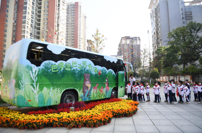 11月10日,長(zhǎng)沙市青園友誼小學(xué)的學(xué)生排隊(duì)進(jìn)入巴士圖書(shū)館。