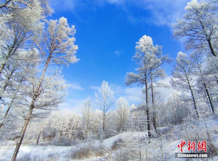 資料圖:根河市出現(xiàn)的大范圍霧凇將群山裝扮成了銀裝素裹的童話世界。 劉麗平 攝