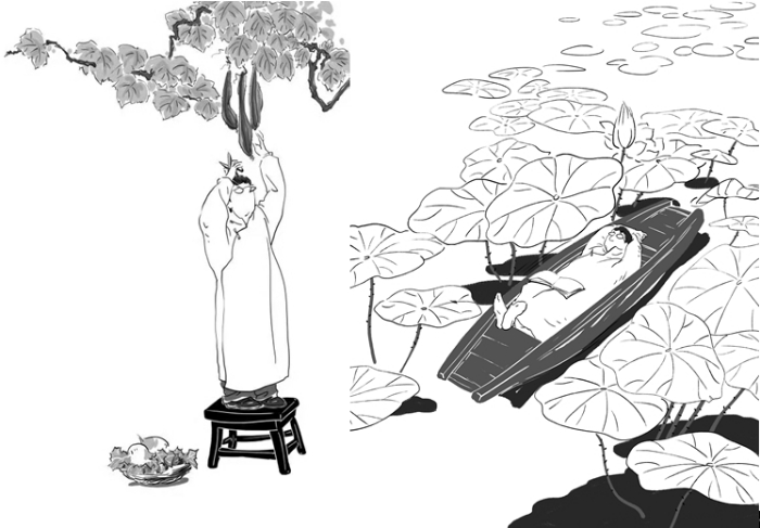 綠葉扶紅花,雅閣、秋雨為這本書的配圖也頗有特色。隨筆《理想與鄉(xiāng)愁》的封面,是一位戴著眼鏡、長(zhǎng)相酷似作者的文人站在小凳子上,準(zhǔn)備將掛在枝頭的絲瓜摘下來以供午餐之需,腳旁一只狗狗看守著筐子里的兩個(gè)大水蘿卜。這幅圖與左面的書名遙相呼應(yīng):作者的“理想”與“鄉(xiāng)愁”就在絲瓜藤下結(jié)為了一體。詩集《人生歸處是田園》的封面是三株樹下,那位戴眼鏡的文人坐在長(zhǎng)椅上,望著右面空椅子上的三只小鳥,一付若有所思的樣子;而葉廷芳為詩集所寫序言文末的尾花,還是這幅圖,只不過沿縱軸轉(zhuǎn)動(dòng)180°——文人從右面望向左面。一里一外兩幅畫互為鏡像,似乎是暗示人們,藝術(shù)就是社會(huì)生活既真實(shí)又不完全一樣的反映。