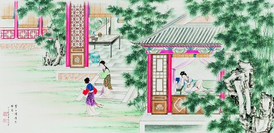 寶玉順腳一徑來(lái)到瀟湘館,信步走入,只見(jiàn)鳳尾森森,龍吟細(xì)細(xì),悄無(wú)人聲。走至窗前,一縷幽香從碧紗窗中暗暗透出。寶玉便將臉貼在紗窗上,往里看時(shí),耳內(nèi)忽聽(tīng)得細(xì)細(xì)的長(zhǎng)嘆了一聲道:“每日家情思睡昏昏。”譚鳳嬛繪